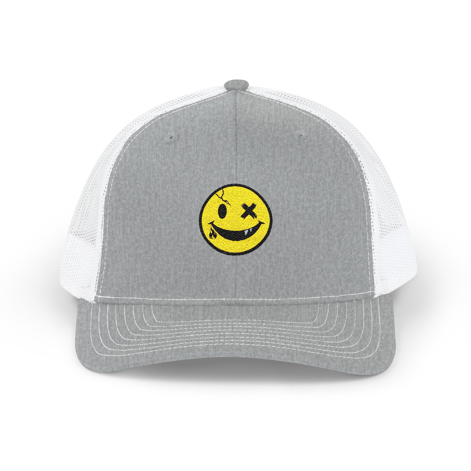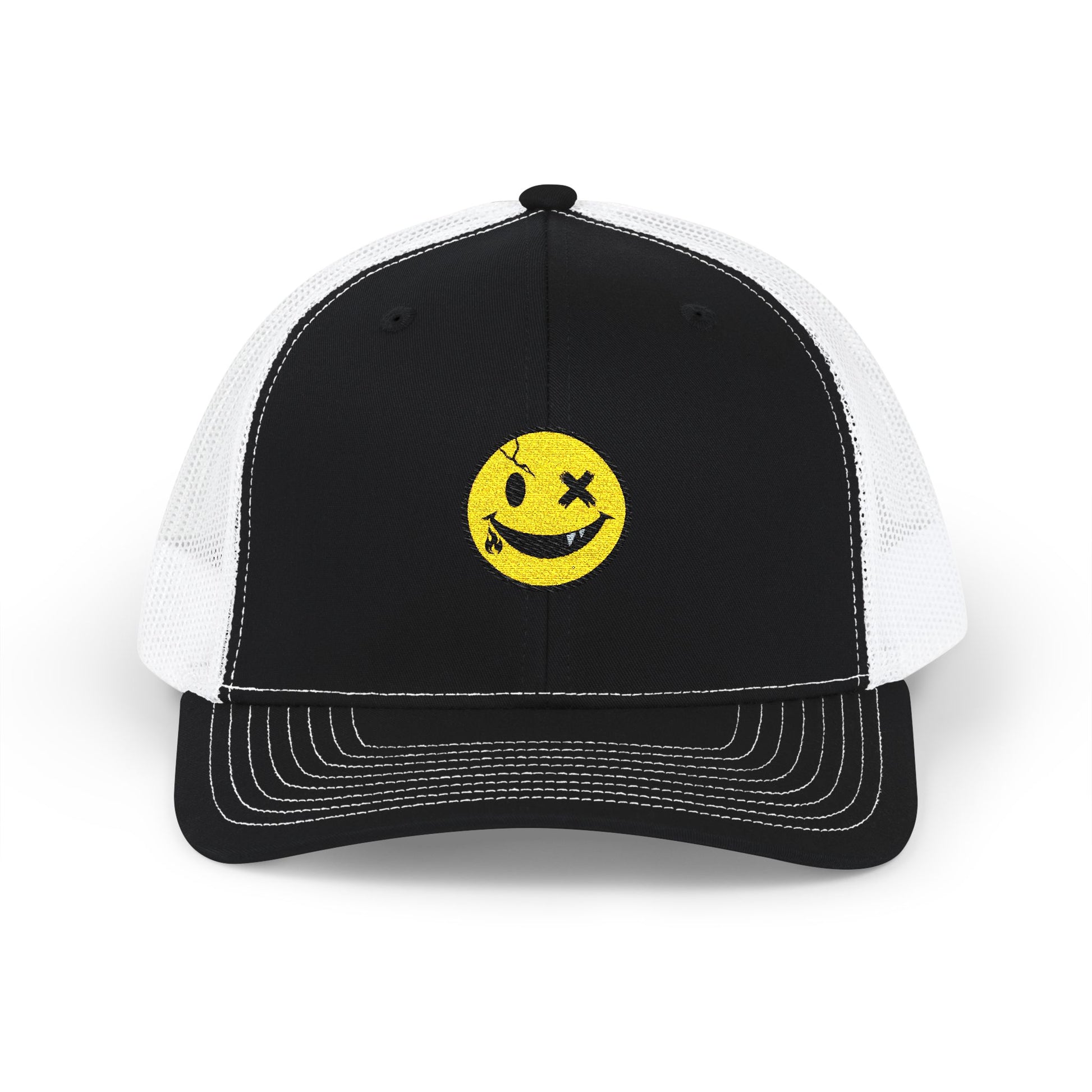 Smiley Winky Trucker Hat — Embroidered Distressed Yellow Smiley Snapback